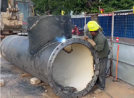 圖為施工人員正在焊接管道